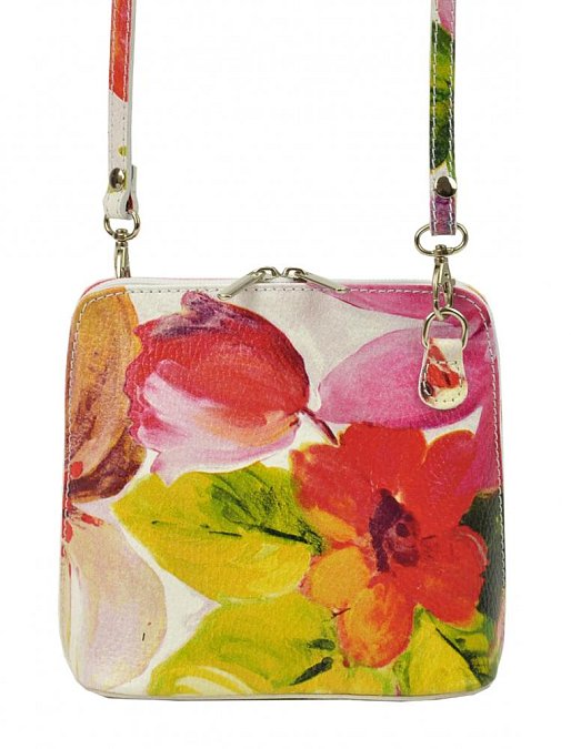 Kožená malá dámska crossbody kabelka s motívom kvetov ružová